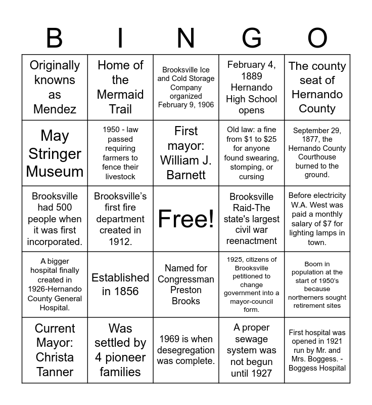 This bingo card has a free space and 24 words: Established in 1856, Was settled by 4 pioneer families, First mayor: William J. Barnett, Current Mayor: Christa Tanner, The county seat of Hernando County, Originally knowns as Mendez, May Stringer Museum, Home of the Mermaid Trail, Brooksville Raid-The state's largest civil war reenactment, Named for Congressman Preston Brooks, Old law: a fine from $1 to $25 for anyone found swearing, stomping, or cursing, Brooksville had 500 people when it was first incorporated., 1925, citizens of Brooksville petitioned to change government into a mayor-council form., Boom in population at the start of 1950’s because northerners sought retirement sites, 1950 - law passed requiring farmers to fence their livestock, A proper sewage system was not begun until 1927, Before electricity W.A. West was paid a monthly salary of $7 for lighting lamps in town., Brooksville Ice and Cold Storage Company organized February 9, 1906, September 29, 1877, the Hernando County Courthouse burned to the ground., Brooksville’s first fire department created in 1912., First hospital was opened in 1921 run by Mr. and Mrs. Boggess. -Boggess Hospital, A bigger hospital finally created in 1926-Hernando County General Hospital., February 4, 1889 Hernando High School opens and 1969 is when desegregation was complete..