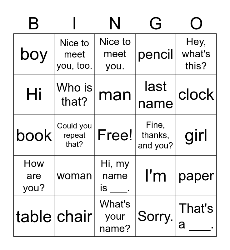 This bingo card has a free space and 27 words: I'm, first name, last name, What's your name?, Hi, Nice to meet you., Nice to meet you, too., How are you?, Fine, thanks, and you?, paper, book, pencil, table, chair, clock, Excuse me., Who is that?, man, woman, boy, girl, Sorry., Could you repeat that?, That's a ___., Hi, my name is ___., Hey, what's this? and It's a ___..