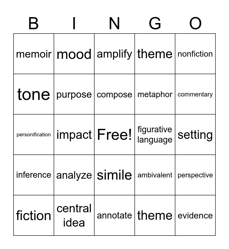 This bingo card has a free space and 24 words: analyze, central idea, compose, fiction, nonfiction, memoir, tone, mood, figurative language, simile, metaphor, personification, ambivalent, perspective, purpose, theme, setting, amplify, commentary, impact, evidence, inference, theme and annotate.