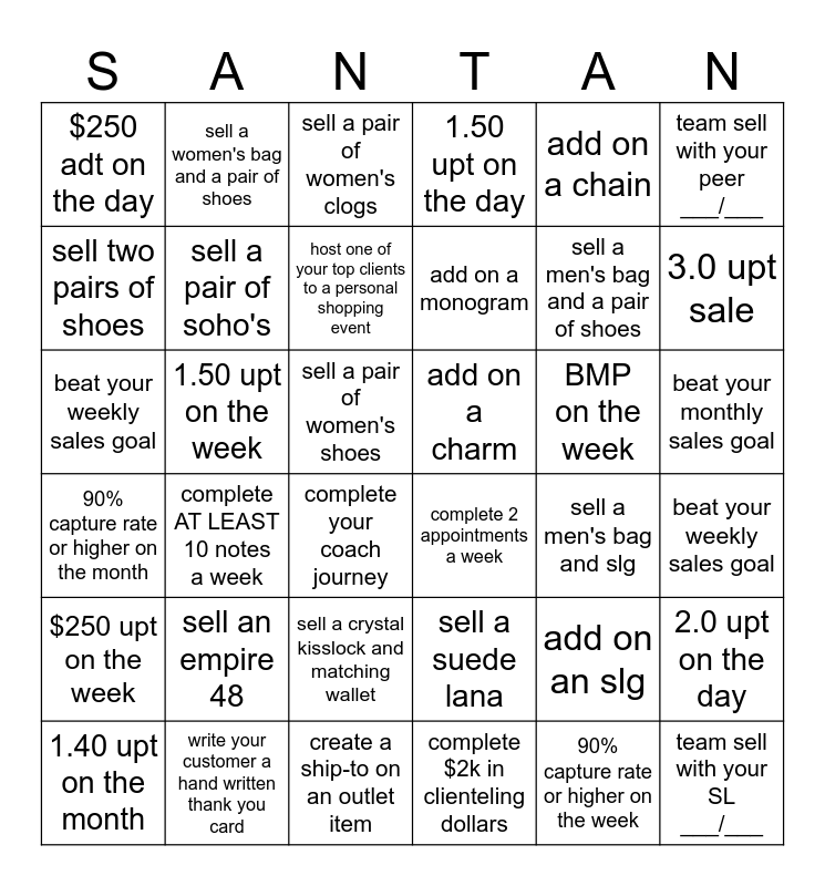 This bingo card has 36 words: sell a suede lana, sell a crystal kisslock and matching wallet, complete $2k in clienteling dollars, sell two pairs of shoes, 90% capture rate or higher on the month, add on a charm, sell a pair of soho's, create a ship-to on an outlet item, add on a chain, add on an slg, 3.0 upt sale, 1.50 upt on the day, 2.0 upt on the day, 1.50 upt on the week, add on a monogram, $250 adt on the day, $250 upt on the week, BMP on the week, beat your weekly sales goal, sell a pair of women's clogs, sell a pair of women's shoes, complete AT LEAST 10 notes a week, complete 2 appointments a week, complete your coach journey, sell a men's bag and slg, sell a women's bag and a pair of shoes, sell a men's bag and a pair of shoes, write your customer a hand written thank you card, host one of your top clients to a personal shopping event, team sell with your peer ___/___, team sell with your SL ___/___, 1.40 upt on the month, beat your weekly sales goal, beat your monthly sales goal, sell an empire 48 and 90% capture rate or higher on the week.