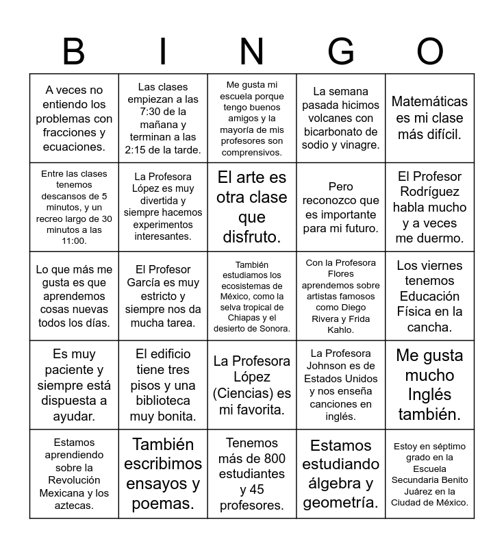 This bingo card has a free space and 46 words: ¡Hola! Me llamo Ana y tengo 13 años., Estoy en séptimo grado en la Escuela Secundaria Benito Juárez en la Ciudad de México., Mi escuela es bastante grande., Tenemos más de 800 estudiantes y 45 profesores., El edificio tiene tres pisos y una biblioteca muy bonita., También tenemos un laboratorio de ciencias, un salón de computación y una cancha de fútbol., Las clases empiezan a las 7:30 de la mañana y terminan a las 2:15 de la tarde., Tenemos ocho períodos de clase, cada uno dura 45 minutos., Entre las clases tenemos descansos de 5 minutos, y un recreo largo de 30 minutos a las 11:00., Ciencias Naturales es mi materia favorita., La Profesora López es muy divertida y siempre hacemos experimentos interesantes., La semana pasada hicimos volcanes con bicarbonato de sodio y vinagre., Me gusta mucho Inglés también., La Profesora Johnson es de Estados Unidos y nos enseña canciones en inglés., Practicamos conversaciones sobre la vida diaria y leemos cuentos cortos., A veces vemos películas con subtítulos., El arte es otra clase que disfruto., Con la Profesora Flores aprendemos sobre artistas famosos como Diego Rivera y Frida Kahlo., Hacemos dibujos, pinturas y esculturas pequeñas con arcilla., Matemáticas es mi clase más difícil., El Profesor García es muy estricto y siempre nos da mucha tarea., Estamos estudiando álgebra y geometría., A veces no entiendo los problemas con fracciones y ecuaciones., Pero reconozco que es importante para mi futuro., La historia puede ser un poco aburrida., El Profesor Rodríguez habla mucho y a veces me duermo., Estamos aprendiendo sobre la Revolución Mexicana y los aztecas., Es interesante, pero prefiero las clases más activas., La Profesora López (Ciencias) es mi favorita., Es muy paciente y siempre está dispuesta a ayudar., Hace que las clases sean divertidas con experimentos y juegos educativos., El Profesor García (Matemáticas) es serio pero justo., Aunque es estricto, realmente se preocupa por que aprendamos bien., La Profesora Martínez (Español) nos hace leer muchos libros., Ahora estamos leyendo "Platero y yo" de Juan Ramón Jiménez., También escribimos ensayos y poemas., Los viernes tenemos Educación Física en la cancha., Jugamos fútbol, básquetbol y hacemos atletismo., El Profesor Hernández es muy enérgico y nos motiva a hacer ejercicio., En Tutoría hablamos sobre nuestros problemas y metas., Mi maestra titular, la Profesora Sánchez, nos ayuda con la organización y nos da consejos para estudiar mejor., Me gusta mi escuela porque tengo buenos amigos y la mayoría de mis profesores son comprensivos., Lo que más me gusta es que aprendemos cosas nuevas todos los días., Lo que menos me gusta es levantarme tan temprano y la cantidad de tarea que tenemos., Mi meta es mejorar en matemáticas y seguir destacando en ciencias. and Quiero ser veterinaria cuando sea grande, así que necesito estudiar mucho..