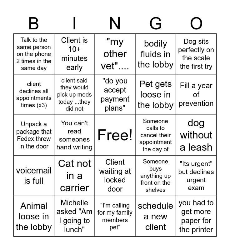 This bingo card has a free space and 24 words: Cat not in a carrier, Michelle asked "Am I going to lunch", "do you accept payment plans", Animal loose in the lobby, Dog sits perfectly on the scale the first try, Talk to the same person on the phone 2 times in the same day, client declines all appointments times (x3), Client is 10+ minutes early, Someone calls to cancel their appointment the day of, Client waiting at locked door, Pet gets loose in the lobby, Unpack a package that Fedex threw in the door, Someone buys anything up front on the shelves, "Its urgent" but declines urgent exam, client said they would pick up meds today ...they did not, schedule a new client, dog without a leash, "my other vet"...., Fill a year of prevention, You can't read someones hand writing, you had to get more paper for the printer, voicemail is full, bodily fluids in the lobby and "I'm calling for my family members pet".