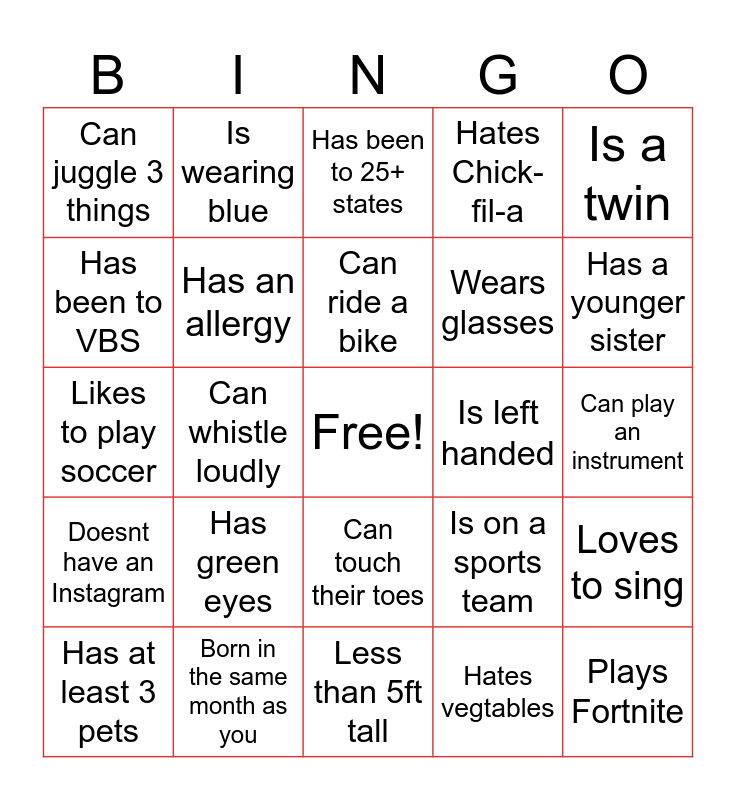 This bingo card has a free space and 24 words: Has at least 3 pets, Has green eyes, Can ride a bike, Hates vegtables, Is a twin, Can juggle 3 things, Is wearing blue, Has been to 25+ states, Is left handed, Can play an instrument, Likes to play soccer, Has an allergy, Is on a sports team, Loves to sing, Has been to VBS, Born in the same month as you, Less than 5ft tall, Hates Chick-fil-a, Has a younger sister, Doesnt have an Instagram, Can whistle loudly, Can touch their toes, Wears glasses and Plays Fortnite.
