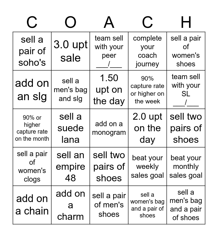 This bingo card has a free space and 24 words: sell an empire 48, add on a charm, 1.50 upt on the day, add on a chain, sell a pair of women's shoes, sell a pair of soho's, add on an slg, 3.0 upt sale, 2.0 upt on the day, sell two pairs of shoes, 90% capture rate or higher on the week, 90% or higher capture rate on the month, beat your weekly sales goal, beat your monthly sales goal, sell a men's bag and slg, sell a women's bag and a pair of shoes, sell two pairs of shoes, team sell with your peer ___/___, team sell with your SL ___/___, sell a suede lana, sell a men's bag and a pair of shoes, sell a pair of women's clogs, complete your coach journey and sell a pair of men's shoes.