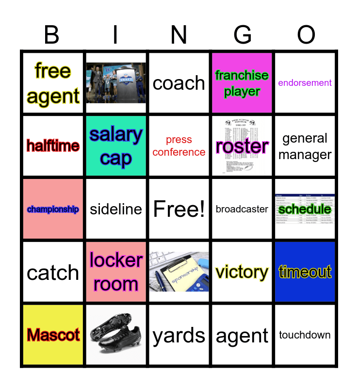 This bingo card has 5 images, a free space and 21 words: locker room, press conference, Mascot, endorsement, free agent, halftime, broadcaster, roster, championship, victory, timeout, salary cap, agent, schedule, coach, general manager, sideline, touchdown, catch, franchise player and yards.
