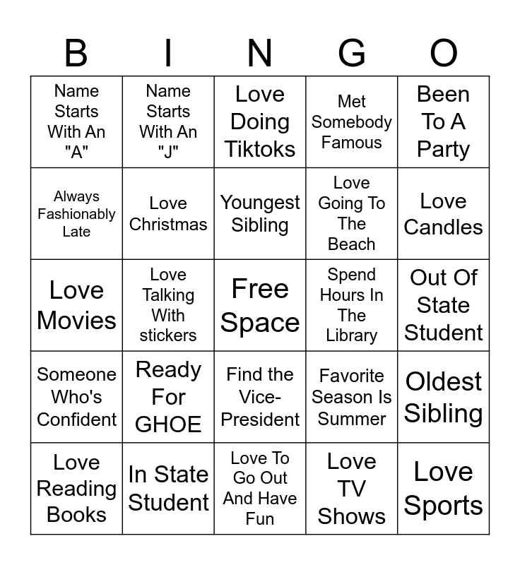This bingo card has a free space and 24 words: Ready For GHOE, In State Student, Youngest Sibling, Love Reading Books, Been To A Party, Name Starts With An "A", Always Fashionably Late, Name Starts With An "J", Spend Hours In The Library, Find the Vice-President, Love Going To The Beach, Love Movies, Favorite Season Is Summer, Oldest Sibling, Love Christmas, Love TV Shows, Out Of State Student, Love Doing Tiktoks, Love Candles, Love Talking With stickers, Love Sports, Someone Who's Confident, Met Somebody Famous and Love To Go Out And Have Fun.