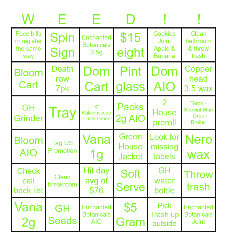 This bingo card has 42 words: Pick Trash up outside, Death row 7pk, Packs 3pk, 2 House preroll, Nero wax, Tag US Promotion, GH Grinder, Ghost, Enchanted Botanicals 3.5g, Torch - Special Blue - Green Broiler, 8" Kaleidoscope - Dark Green, Pint glass, Copper head 3.5 wax, Cookies Joint Apple & Banana, GH Seeds, Bloom AIO, Throw trash, Dom AIO, Enchanted Botanicals Joint, Spin Sign, Clean bathroom & throw trash, Hit day avg of $76, Check call back list, Face bills in register the same way, Google Review, Vana 2g, Dom Cart, Cookies Joint Apple & Banana, Clean breakroom, GH water bottle, GH wax, Packs 2g AIO, Bloom Cart, Look for missing labels, Enchanted Botanicals AIO, Vana 1g, Green House Jacket, Tray, Soft Serve, $5 Gram, $15 eight and OZ special.