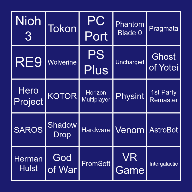 This bingo card has 25 words: Shadow Drop, FromSoft, PS Plus, Herman Hulst, Pragmata, Nioh 3, RE9, Tokon, Physint, Hardware, Uncharged, Hero Project, Venom, AstroBot, Wolverine, Intergalactic, 1st Party Remaster, PC Port, Ghost of Yotei, KOTOR, Horizon Multiplayer, God of War, SAROS, Phantom Blade 0 and VR Game.