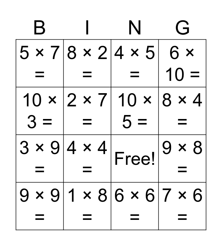 This bingo card has 19 words: Free!, 2 × 3 =, 4 × 5 =, 7 × 6 =, 9 × 8 =, 10 × 3 =, 6 × 6 =, 5 × 7 =, 8 × 2 =, 3 × 9 =, 4 × 4 =, 2 × 7 =, 10 × 5 =, 1 × 8 =, 9 × 9 =, 7 × 3 =, 6 × 10 =, 8 × 4 = and 5 × 2 =.
