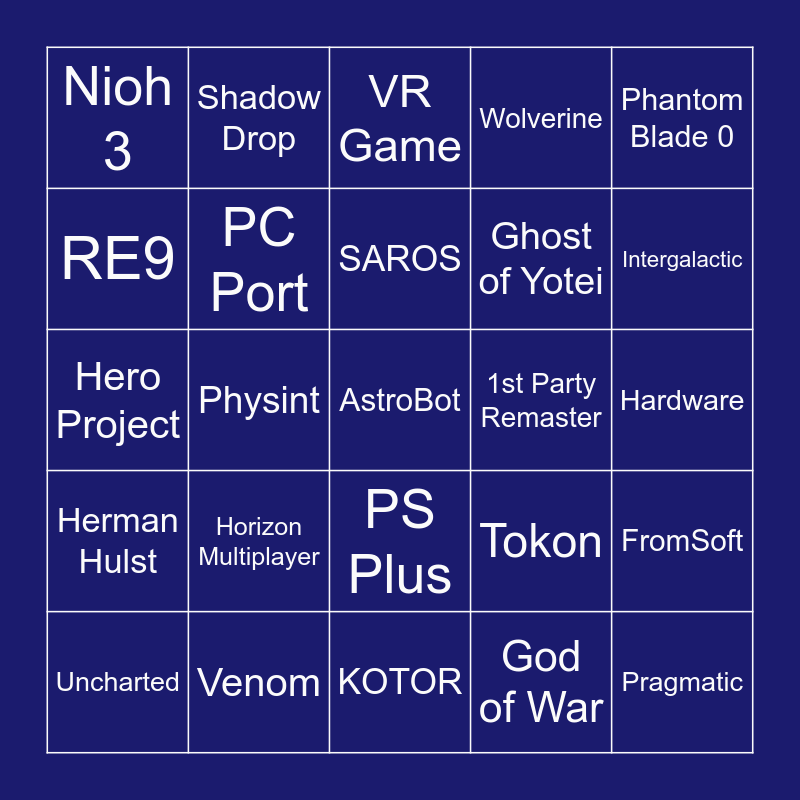 This bingo card has a free space and 24 words: Uncharted, Horizon Multiplayer, SAROS, God of War, Phantom Blade 0, Nioh 3, Shadow Drop, VR Game, 1st Party Remaster, Hardware, Hero Project, PC Port, Tokon, FromSoft, RE9, Venom, KOTOR, Wolverine, Intergalactic, Herman Hulst, Physint, PS Plus, Ghost of Yotei and Pragmatic.