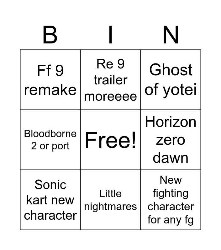 This bingo card has a free space and 8 words: Horizon zero dawn, Ghost of yotei, Re 9 trailer moreeee, Sonic kart new character, Ff 9 remake, New fighting character for any fg, Bloodborne 2 or port and Little nightmares.