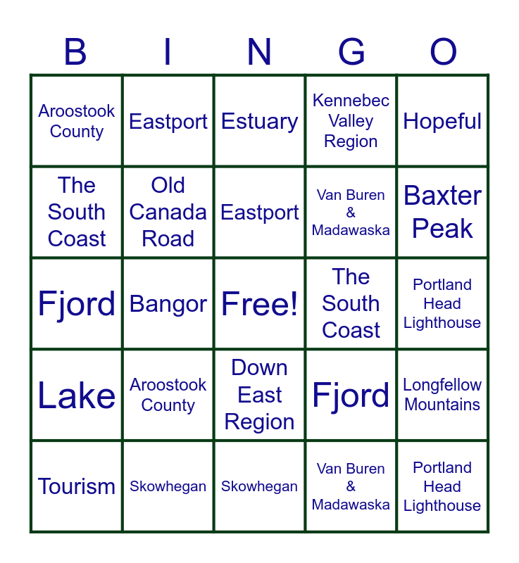 ⚠ This card has duplicate items: Tourism (2), Plateau (2), Aroostook County (2), Skowhegan (2), Augusta, Waterville, & Gardiner (2), Old Canada Road (2), Appalachian Mtn. Region (2), Van Buren & Madawaska (2), Moxie Falls (2), Kennebec Valley Region (2), Gulf Hagas (2), Longfellow Mountains (2), Highlands Region (2), Grafton Notch State Par (2), 4,000 foot mountain peaks (2), Hopeful (2), Bangor (2), Bryant Pond (2), Portland Head Lighthouse (2), The South Coast (2), Midcoast Region (2), Fjord (2), Estuary (2), Lake (2), Eastport (2), Down East Region (2), Rachel Carson Wildlife Refuge (2)
