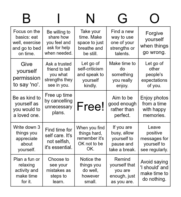 This bingo card has a free space and 25 words: Find time for self care. It's not selfish, it's essential., Notice the things you do well, however small., Let go of self-criticism and speak to yourself kindly., Plan a fun or relaxing activity and make time for it., Forgive yourself when things go wrong., Focus on the basics: eat well, exercise and go to bed on time., Give yourself permission to say 'no'., Be willing to share how you feel and ask for help when needed., Aim to be good enough rather than perfect., When you find things hard, remember it's OK not to be OK., Make time to do something you really enjoy., Be as kind to yourself as you would to a loved one., If you are busy, allow yourself to pause and take a break., Leave positive messages for yourself to see regularly., Ask a trusted friend to tell you what strengths they see in you., Notice what you are feeling without any judgement., Enjoy photos from a time with happy memories., Take your time. Make space to just breathe and be still., Let go of other people's expectations of you., Free up time by cancelling unnecessary plans., Avoid saying 'I should' and make time to do nothing., Choose to see your mistakes as steps to learn., Write down 3 things you appreciate about yourself., Find a new way to use one of your strengths or talents. and Remind yourself that you are enough, just as you are..