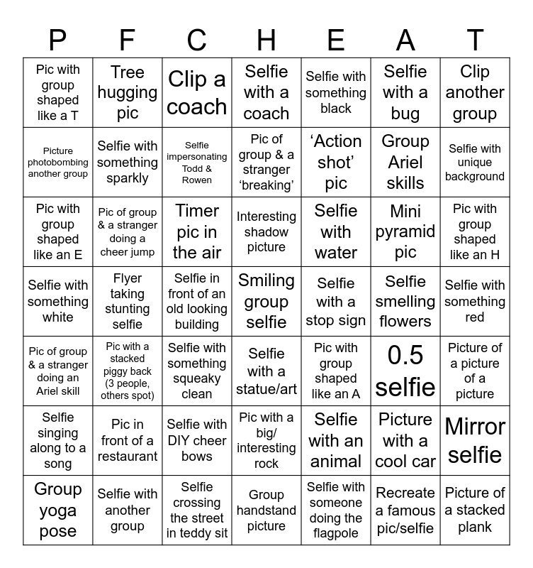 This bingo card has a free space and 48 words: Selfie with an animal, Group Ariel skills, Group handstand picture, Flyer taking stunting selfie, Timer pic in the air, Selfie with something red, Tree hugging pic, Selfie with another group, Selfie with a bug, Selfie with a statue/art, Clip another group, Selfie with a coach, Mini pyramid pic, Selfie with water, Selfie singing along to a song, Selfie smelling flowers, Picture photobombing another group, Selfie with unique background, Picture with a cool car, Selfie with something black, ‘Action shot’ pic, Selfie in front of an old looking building, Pic with group shaped like a T, Selfie with something sparkly, Mirror selfie, Selfie impersonating Todd & Rowen, Pic with group shaped like an H, Group yoga pose, Interesting shadow picture, Pic of group & a stranger doing a cheer jump, Recreate a famous pic/selfie, Selfie with a stop sign, Picture of a picture of a picture, Pic in front of a restaurant, Selfie with something white, Pic with group shaped like an A, 0.5 selfie, Pic with group shaped like an E, Selfie with something squeaky clean, Selfie with DIY cheer bows, Pic of group & a stranger doing an Ariel skill, Picture of a stacked plank, Clip a coach, Selfie crossing the street in teddy sit, Pic of group & a stranger ‘breaking’, Pic with a big/ interesting rock, Pic with a stacked piggy back (3 people, others spot) and Selfie with someone doing the flagpole.