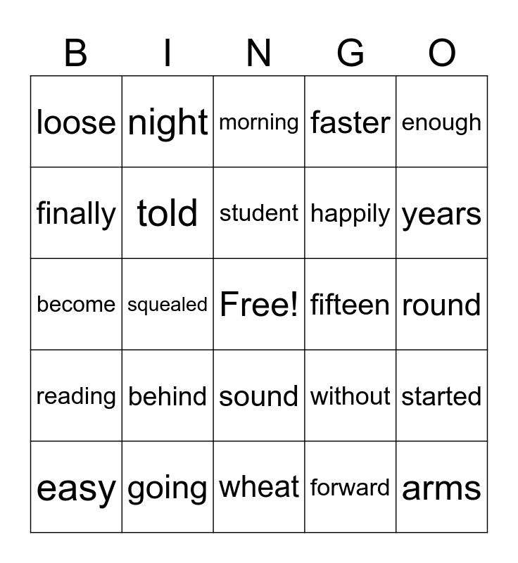 This bingo card has a free space and 34 words: found, forward, mind, force, reading, told, enough, easy, night, body, student, morning, before, dawn, fifteen, years, going, become, behind, without, sound, stumbling, loose, round, wheat, arms, faster, softly, happily, finally, arrived, squealed, started and eagerly.