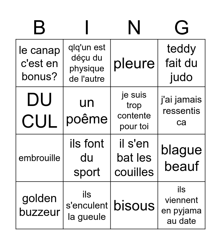 This bingo card has 16 words: ils s'enculent la gueule, blague beauf, pleure, le canap c'est en bonus?, embrouille, qlq'un est déçu du physique de l'autre, il s'en bat les couilles, bisous, DU CUL, un poême, golden buzzeur, teddy fait du judo, ils font du sport, j'ai jamais ressentis ca, je suis trop contente pour toi and ils viennent en pyjama au date.