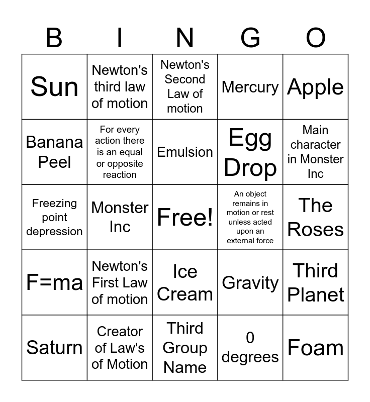 This bingo card has a free space and 24 words: Newton's First Law of motion, Creator of Law's of Motion, Emulsion, Saturn, Apple, Sun, Banana Peel, Newton's third law of motion, An object remains in motion or rest unless acted upon an external force, Ice Cream, Egg Drop, Freezing point depression, Gravity, Third Planet, For every action there is an equal or opposite reaction, 0 degrees, The Roses, Newton's Second Law of motion, Main character in Monster Inc, Monster Inc, Foam, F=ma, Mercury and Third Group Name.