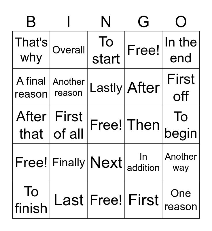 This bingo card has a free space and 24 words: Finally, Last, Lastly, To finish, In the end, That's why, A final reason, Overall, Then, Next, After, After that, In addition, Another way, Another reason, First, To begin, To start, First off, First of all, One reason, Free!, Free! and Free!.
