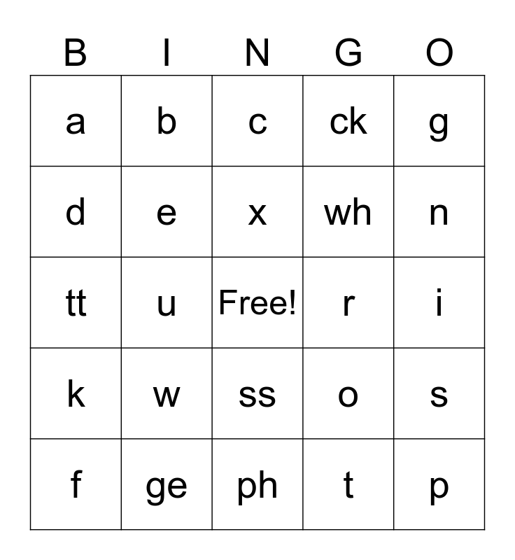 This bingo card has a free space and 24 words: f, w, x, t, g, a, b, c, r, i, tt, e, o, s, d, ge, ph, ck, n, k, u, ss, wh and p.