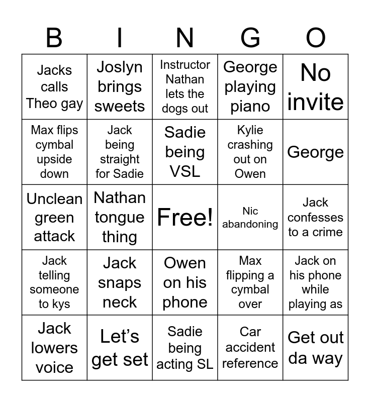 This bingo card has a free space and 25 words: Jack snaps neck, Sadie being acting SL, Sadie being VSL, Jack lowers voice, No invite, Jacks calls Theo gay, Max flips cymbal upside down, Joslyn brings sweets, Nic abandoning, Owen on his phone, Kylie crashing out on Owen, Unclean green attack, Max flipping a cymbal over, Jack on his phone while playing as, Jack being straight for Sadie, Jack can’t high 5, Jack confesses to a crime, Instructor Nathan lets the dogs out, George, Nathan tongue thing, Get out da way, Let’s get set, Jack telling someone to kys, George playing piano and Car accident reference.