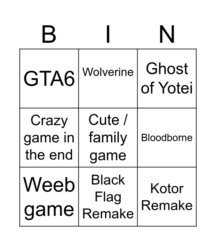 This bingo card has a free space and 8 words: Bloodborne, Ghost of Yotei, Wolverine, Weeb game, GTA6, Kotor Remake, Crazy game in the end and Black Flag Remake.