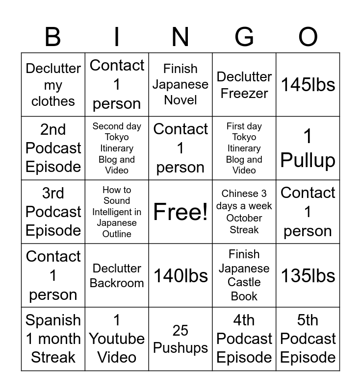 This bingo card has a free space and 24 words: Declutter Backroom, 1 Youtube Video, Contact 1 person, Spanish 1 month Streak, 145lbs, Declutter my clothes, 2nd Podcast Episode, Contact 1 person, Chinese 3 days a week October Streak, 140lbs, First day Tokyo Itinerary Blog and Video, 3rd Podcast Episode, Finish Japanese Castle Book, 135lbs, Second day Tokyo Itinerary Blog and Video, 4th Podcast Episode, Contact 1 person, Finish Japanese Novel, 1 Pullup, How to Sound Intelligent in Japanese Outline, 5th Podcast Episode, Contact 1 person, Declutter Freezer and 25 Pushups.