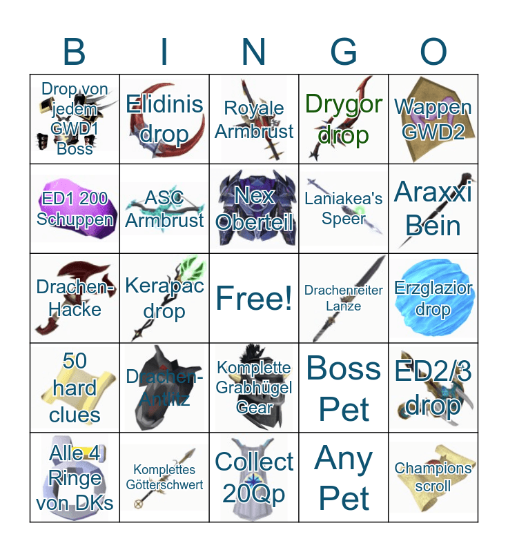 This bingo card has 22 images, a free space and 24 words: Drachen-Antlitz, Komplettes Götterschwert, Nex Oberteil, Alle 4 Ringe von DKs, Wappen GWD2, Drop von jedem GWD1 Boss, ED1 200 Schuppen, Elidinis drop, Drachenreiter Lanze, Komplette Grabhügel Gear, Laniakea's Speer, Drachen-Hacke, Boss Pet, ED2/3 drop, ASC Armbrust, Any Pet, Erzglazior drop, Royale Armbrust, Araxxi Bein, Kerapac drop, Champions scroll, 50 hard clues, Drygor drop and Collect 20Qp.