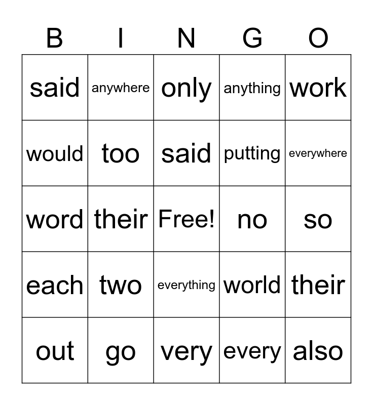 This bingo card has a free space and 29 words: out, about, their, front, said, only, too, two, no, go, so, also, very, every, everywhere, everyone, everything, each, work, word, world, becoming, putting, would, anything, anywhere, their, said and does.