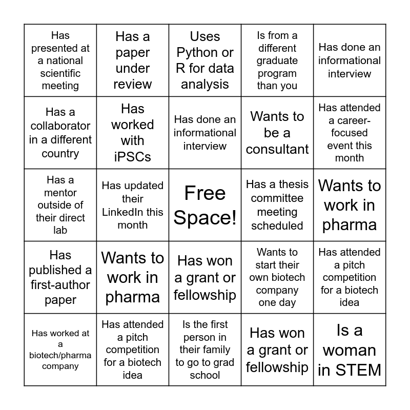 ⚠ This card has duplicate items: Has a paper under review (2), Has published a first-author paper (2), Works with CRISPR (2), Uses single-cell sequencing (2), Has won a grant or fellowship (2), Is a member of a professional society (2), Is from a different graduate program than you (2), Is a big fan of a biotech podcast (2), Has a collaborator in a different country (2), Uses Python or R for data analysis (2), Has presented at a national scientific meeting (2), Has a mentor outside of their direct lab (2), Has attended a pitch competition for a biotech idea (2), Has worked at a biotech/pharma company (2), Has worked with iPSCs (2), Is the first person in their family to go to grad school (2), Is a woman in STEM (2), Wants to be a consultant (2), Wants to work at a startup (2), Wants to work in pharma (2), Wants to start their own biotech company one day (2), Has worked with mice in their research (2), Has a thesis committee meeting scheduled (2), Has done an informational interview (2), Has updated their LinkedIn this month (2)