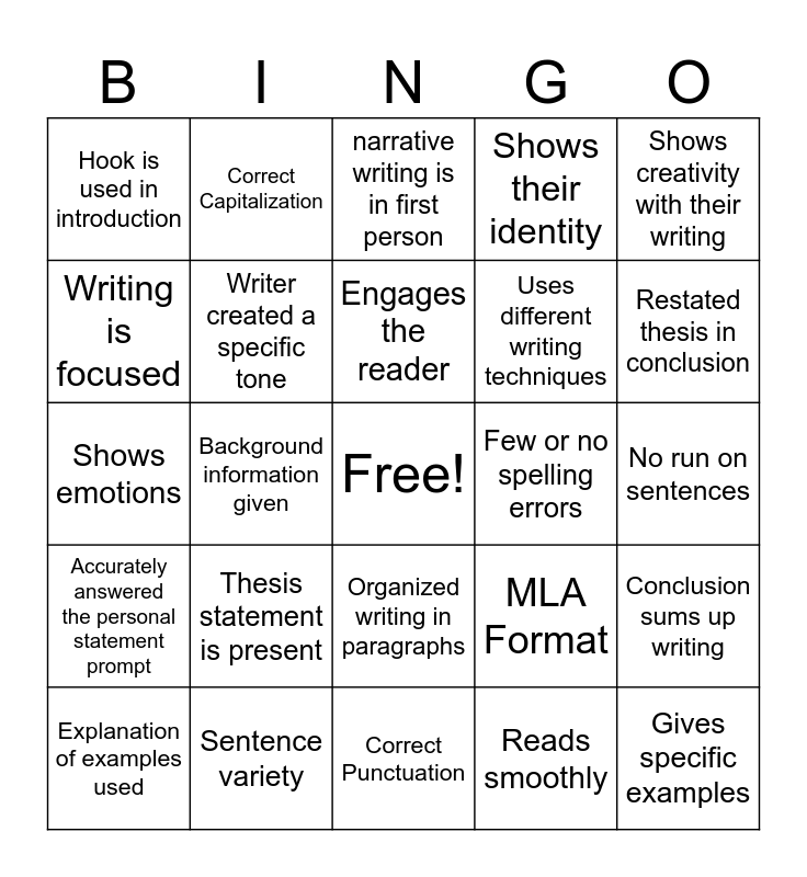 This bingo card has a free space and 24 words: Thesis statement is present, Sentence variety, Engages the reader, Explanation of examples used, Shows creativity with their writing, Hook is used in introduction, Writing is focused, Correct Capitalization, Few or no spelling errors, Organized writing in paragraphs, Uses different writing techniques, Shows emotions, MLA Format, Conclusion sums up writing, Writer created a specific tone, Reads smoothly, No run on sentences, narrative writing is in first person, Restated thesis in conclusion, Background information given, Gives specific examples, Accurately answered the personal statement prompt, Shows their identity and Correct Punctuation.