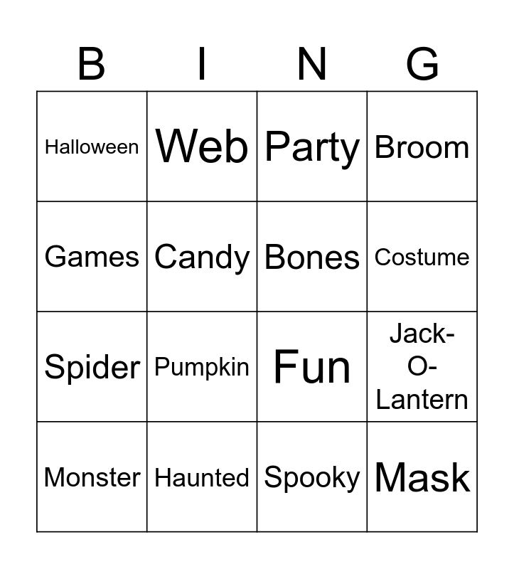 This bingo card has 35 words: Free!, Bats, Black, Bones, Boo, Broom, Candy, Cauldron, Costume, Friends, Fun, Games, Ghost, Goblin, Halloween, Haunted, Howl, Jack-O-Lantern, Mask, Monster, Moon, Mummy, Night, October, Party, Pumpkin, Scary, Skeleton, Spider, Spooky, Treat, Trick, Vampire, Web and Witch.