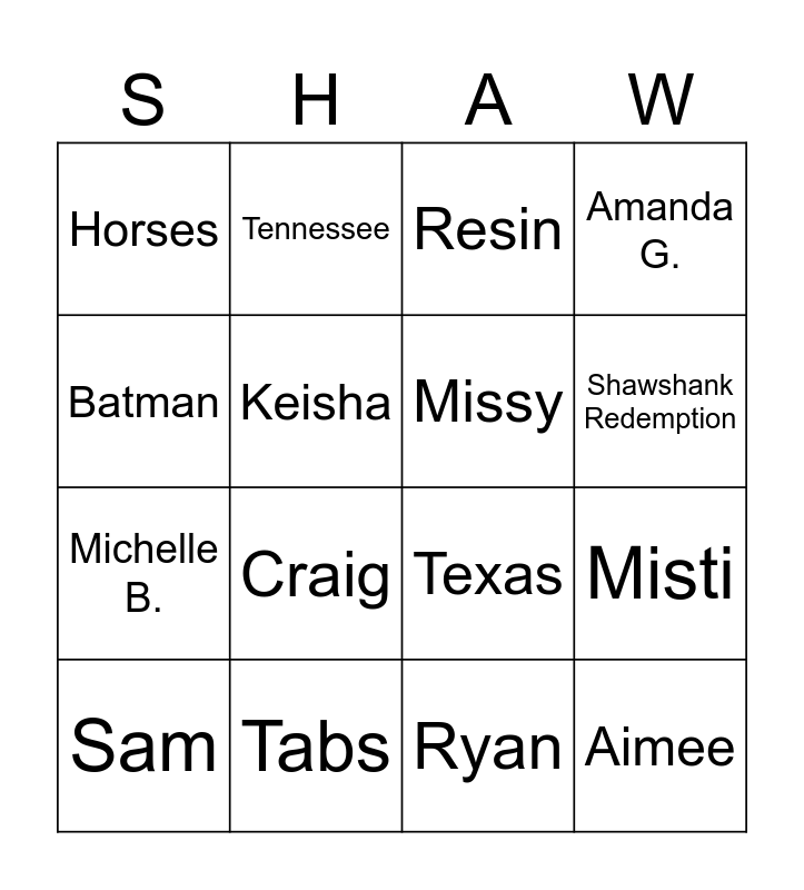 This bingo card has 32 words: Jim, Christian, Misti, Grumpy Cat, Aimee, Missy, Batman, Crenshaw, Tennessee, North Carolina, Shawshank Redemption, Resin, Nikole, Katelynn, Tabs, Mr. A, Chuck, Texas, Indiana, Mike, Clowns, Hobby Horse, Ryan, Taylor B., Sam, Amanda G., Michelle B., Keisha, Horses, Courtney, Kid Rock and Craig.
