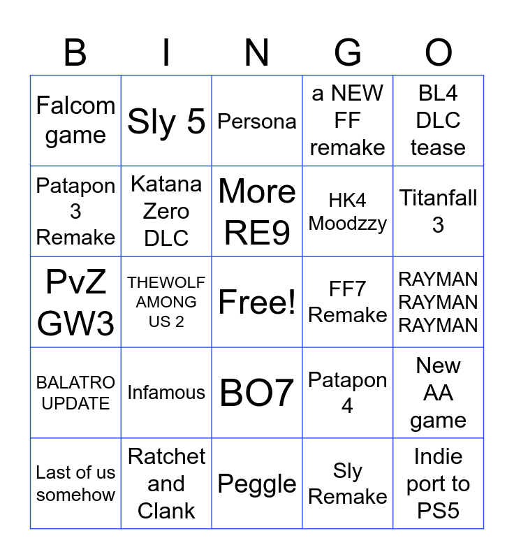 This bingo card has a free space and 24 words: Infamous, Ratchet and Clank, More RE9, Last of us somehow, BL4 DLC tease, Falcom game, Patapon 3 Remake, Sly 5, FF7 Remake, BO7, HK4 Moodzzy, PvZ GW3, Patapon 4, New AA game, Katana Zero DLC, Sly Remake, RAYMAN RAYMAN RAYMAN, Persona, Titanfall 3, THEWOLF AMONG US 2, Indie port to PS5, BALATRO UPDATE, a NEW FF remake and Peggle.
