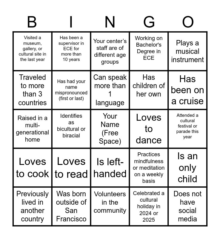This bingo card has a free space and 24 words: Previously lived in another country, Loves to read, Can speak more than 1 language, Celebrated a cultural holiday in 2024 or 2025, Plays a musical instrument, Visited a museum, gallery, or cultural site in the last year, Has been a supervisor in ECE for more than 10 years, Your center’s staff are of different age groups, Loves to dance, Attended a cultural festival or parade this year, Raised in a multi-generational home, Has had your name mispronounced (first or last), Practices mindfulness or meditation on a weekly basis, Is an only child, Traveled to more than 3 countries, Was born outside of San Francisco, Volunteers in the community, Working on Bachelor's Degree in ECE, Has been on a cruise, Loves to cook, Identifies as bicultural or biracial, Is left-handed, Has children of her own and Does not have social media.