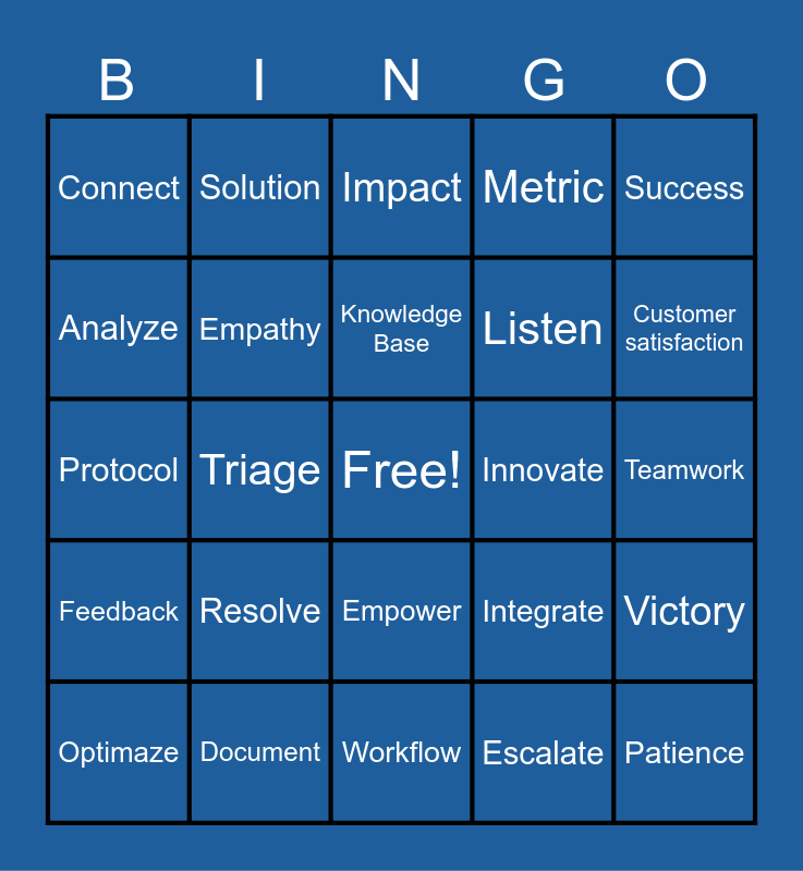 This bingo card has a free space and 24 words: Resolve, Document, Knowledge Base, Optimaze, Success, Connect, Analyze, Solution, Innovate, Empower, Listen, Protocol, Integrate, Victory, Empathy, Escalate, Teamwork, Impact, Customer satisfaction, Triage, Patience, Feedback, Metric and Workflow.