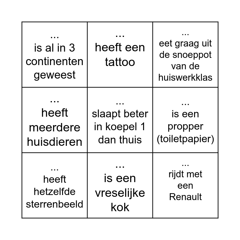 This bingo card has 9 words: ... heeft hetzelfde sterrenbeeld, ... eet graag uit de snoeppot van de huiswerkklas, ... heeft een tattoo, ... heeft meerdere huisdieren, ... is al in 3 continenten geweest, ... is een propper (toiletpapier), ... slaapt beter in koepel 1 dan thuis, ... rijdt met een Renault and ... is een vreselijke kok.