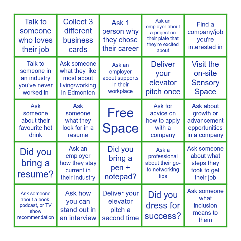 This bingo card has a free space and 24 words: Ask an employer how they stay current in their industry, Ask how you can stand out in an interview, Ask an employer about supports in their workplace, Ask someone about a book, podcast, or TV show recommendation, Find a company/job you're interested in, Talk to someone who loves their job, Talk to someone in an industry you've never worked in, Collect 3 different business cards, Ask for advice on how to apply with a company, Did you bring a pen + notepad?, Deliver your elevator pitch once, Ask someone about their favourite hot drink, Ask a professional about their go-to networking tips, Ask someone about what steps they took to get their job, Ask someone what they like most about living/working in Edmonton, Did you dress for success?, Ask about growth or advancement opportunities in a company, Ask 1 person why they chose their career, Visit the on-site Sensory Space, Ask someone what they look for in a resume, Ask someone what inclusion means to them, Did you bring a resume?, Ask an employer about a project on their plate that they're excited about and Deliver your elevator pitch a second time.