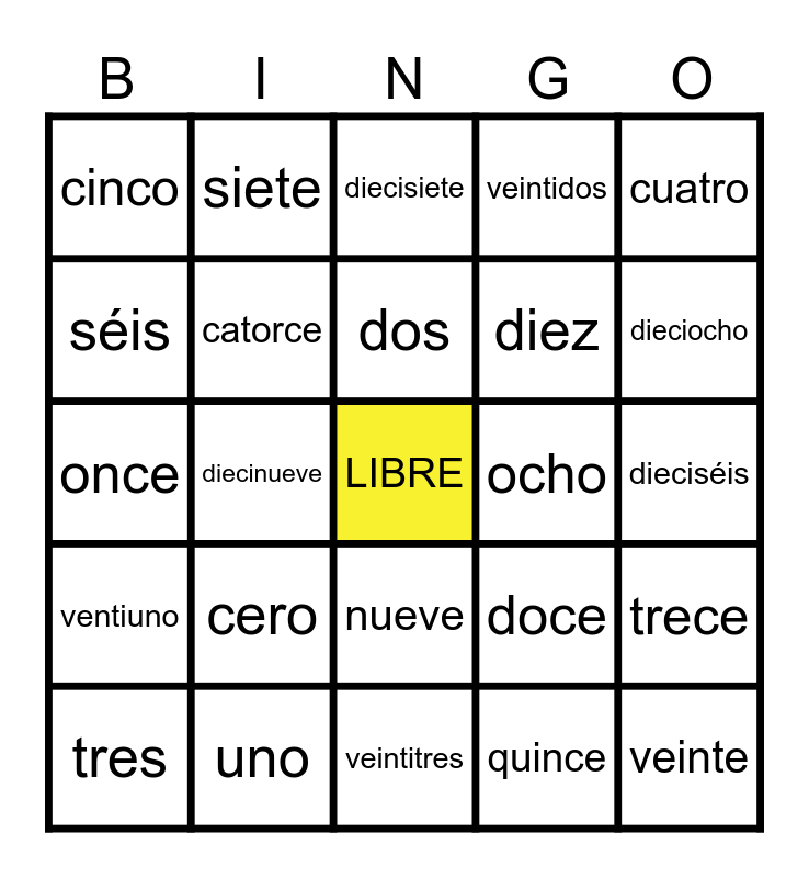 This bingo card has a free space and 24 words: cero, uno, dos, tres, cuatro, cinco, séis, siete, ocho, nueve, diez, once, doce, trece, catorce, quince, dieciséis, diecisiete, dieciocho, diecinueve, veinte, ventiuno, veintidos and veintitres.