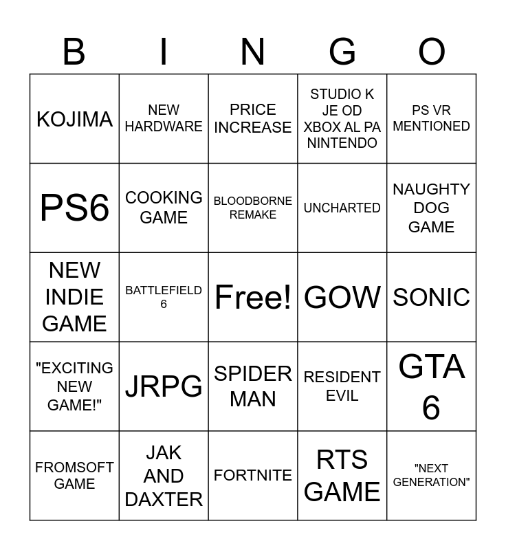 This bingo card has a free space and 24 words: JRPG, JAK AND DAXTER, BLOODBORNE REMAKE, FROMSOFT GAME, PS VR MENTIONED, KOJIMA, PS6, NEW HARDWARE, GOW, SPIDER MAN, UNCHARTED, NEW INDIE GAME, RESIDENT EVIL, GTA 6, COOKING GAME, RTS GAME, SONIC, PRICE INCREASE, NAUGHTY DOG GAME, BATTLEFIELD 6, "NEXT GENERATION", "EXCITING NEW GAME!", STUDIO K JE OD XBOX AL PA NINTENDO and FORTNITE.