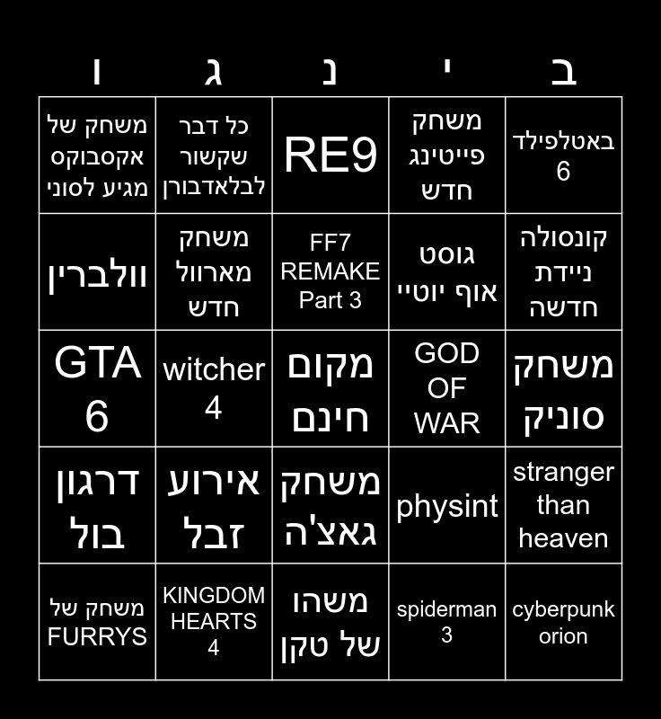 This bingo card has a free space and 24 words: אירוע זבל, KINGDOM HEARTS 4, FF7 REMAKE Part 3, משחק של FURRYS, באטלפילד 6, משחק של אקסבוקס מגיע לסוני, וולברין, כל דבר שקשור לבלאדבורן, GOD OF WAR, משחק גאצ'ה, גוסט אוף יוטיי, GTA 6, physint, stranger than heaven, משחק מארוול חדש, spiderman 3, משחק סוניק, RE9, קונסולה ניידת חדשה, witcher 4, cyberpunk orion, דרגון בול, משחק פייטינג חדש and משהו של טקן.