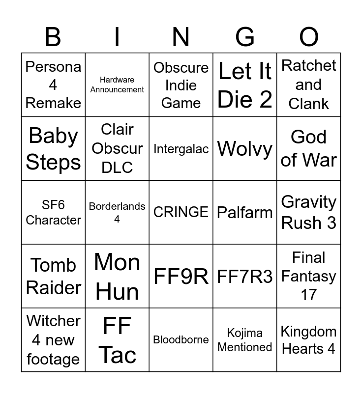 This bingo card has a free space and 24 words: Mon Hun, FF Tac, Intergalac, Witcher 4 new footage, Ratchet and Clank, Persona 4 Remake, Baby Steps, Hardware Announcement, Palfarm, FF9R, Wolvy, SF6 Character, FF7R3, Final Fantasy 17, Clair Obscur DLC, Kojima Mentioned, Gravity Rush 3, Obscure Indie Game, God of War, Borderlands 4, Kingdom Hearts 4, Tomb Raider, Let It Die 2 and Bloodborne.