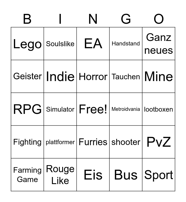 This bingo card has a free space and 24 words: plattformer, Rouge Like, Horror, Farming Game, Ganz neues, Lego, Geister, Soulslike, Metroidvania, Furries, Tauchen, RPG, shooter, PvZ, Indie, Bus, lootboxen, EA, Mine, Simulator, Sport, Fighting, Handstand and Eis.