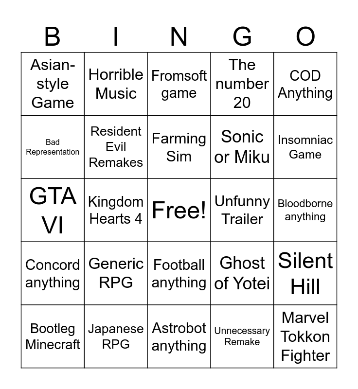 This bingo card has a free space and 24 words: Generic RPG, Japanese RPG, Farming Sim, Bootleg Minecraft, COD Anything, Asian-style Game, Bad Representation, Horrible Music, Unfunny Trailer, Football anything, Sonic or Miku, GTA VI, Ghost of Yotei, Silent Hill, Resident Evil Remakes, Unnecessary Remake, Bloodborne anything, Fromsoft game, Insomniac Game, Kingdom Hearts 4, Marvel Tokkon Fighter, Concord anything, The number 20 and Astrobot anything.
