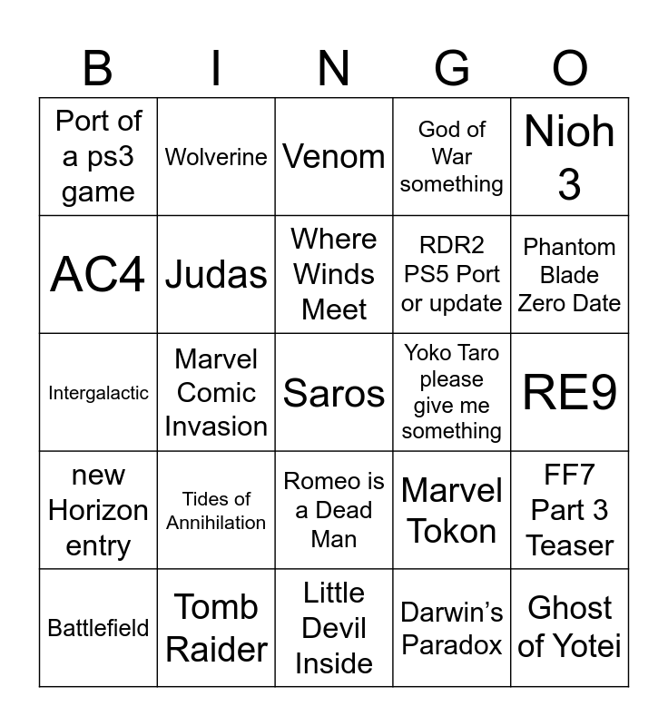 This bingo card has a free space and 24 words: Tides of Annihilation, Tomb Raider, Where Winds Meet, Battlefield, Nioh 3, Port of a ps3 game, AC4, Wolverine, Yoko Taro please give me something, Romeo is a Dead Man, RDR2 PS5 Port or update, Intergalactic, Marvel Tokon, FF7 Part 3 Teaser, Judas, Darwin’s Paradox, RE9, Venom, Phantom Blade Zero Date, Marvel Comic Invasion, Ghost of Yotei, new Horizon entry, God of War something and Little Devil Inside.