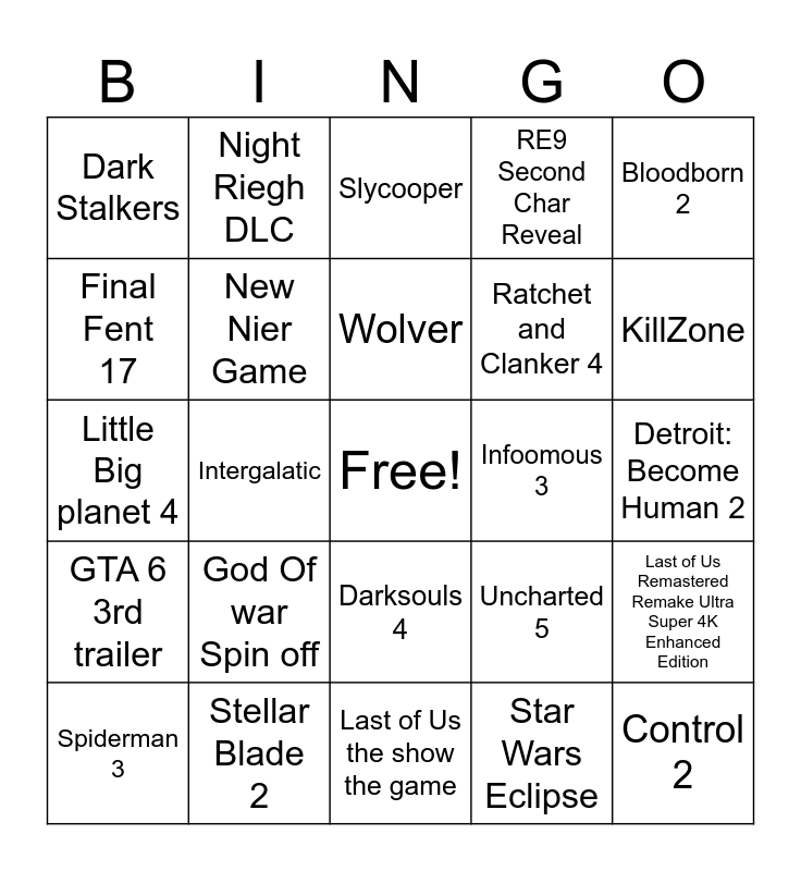 This bingo card has a free space and 24 words: God Of war Spin off, Stellar Blade 2, Wolver, Spiderman 3, Bloodborn 2, Dark Stalkers, Final Fent 17, Night Riegh DLC, Infoomous 3, Darksouls 4, Ratchet and Clanker 4, Little Big planet 4, Uncharted 5, Last of Us Remastered Remake Ultra Super 4K Enhanced Edition, New Nier Game, Star Wars Eclipse, Detroit: Become Human 2, Slycooper, KillZone, Intergalatic, Control 2, GTA 6 3rd trailer, RE9 Second Char Reveal and Last of Us the show the game.