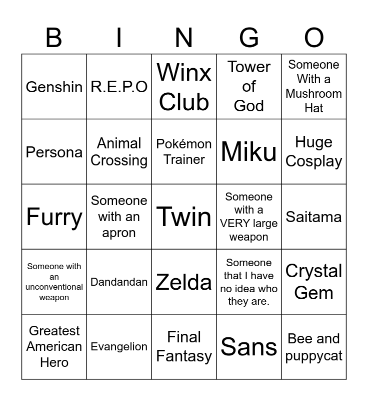 This bingo card has a free space and 24 words: Dandandan, Evangelion, Pokémon Trainer, Greatest American Hero, Someone With a Mushroom Hat, Genshin, Persona, R.E.P.O, Someone with a VERY large weapon, Zelda, Miku, Furry, Someone that I have no idea who they are., Crystal Gem, Animal Crossing, Sans, Saitama, Winx Club, Huge Cosplay, Someone with an apron, Bee and puppycat, Someone with an unconventional weapon, Tower of God and Final Fantasy.