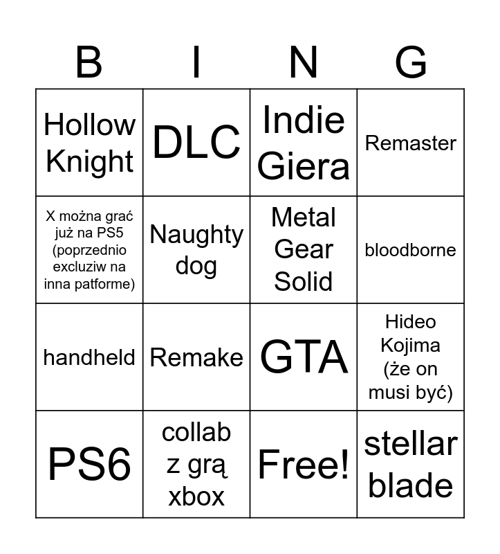 This bingo card has 17 words: Free!, PS6, Indie Giera, Hollow Knight, Remake, Remaster, Hideo Kojima (że on musi być), Metal Gear Solid, bloodborne, Naughty dog, collab z grą xbox, GTA, X można grać już na PS5 (poprzednio excluziw na inna patforme), DLC, handheld, gooner game and stellar blade.