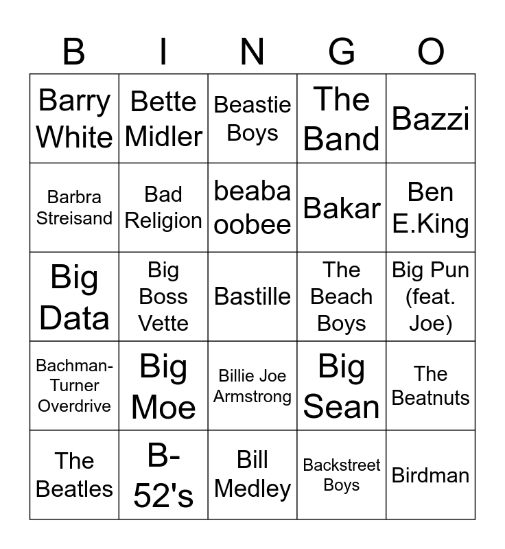 This bingo card has 60 words: B2K, B-52's, Baby Bash, Bachman-Turner Overdrive, Backstreet Boys, Bad Bunny, Bad Religion, Baha Men, Bakar, Banana rama, The Band, The Bangles, Barbra Streisand, Barenaked Ladies, Barry Manilow, Barry White, Bastille, Bazzi, B.B. King, beaba oobee, The Beach Boys, Beastie Boys, The Beatles, The Beatnuts, Beck, Bee Gees, Belinda Carlisle, Bell Biv DeVoe, Ben E.King, Benny Benassi, benny blanco (with Halsey & Khalid), Benson Boone, Berlin, Bertie Higgins, Bette Midler, Beyoncé, Big Boi, Big Boss Vette, Big Daddy Kane, Big Data, Big Gigantic (feat. Angela McCluskey), Big Moe, Big Pun (feat. Joe), Big & Rich, Big Sean, Big Tymers, BigXtha Plug, Billie Eilish, Billie Holiday, Billie Joe Armstrong, Bill Medley, Bill Withers, Billy Idol, Billy Joel, Billy Ocean, Billy Ray Cyrus, Billy Squier, Billy Strings, Birdman and Björk.