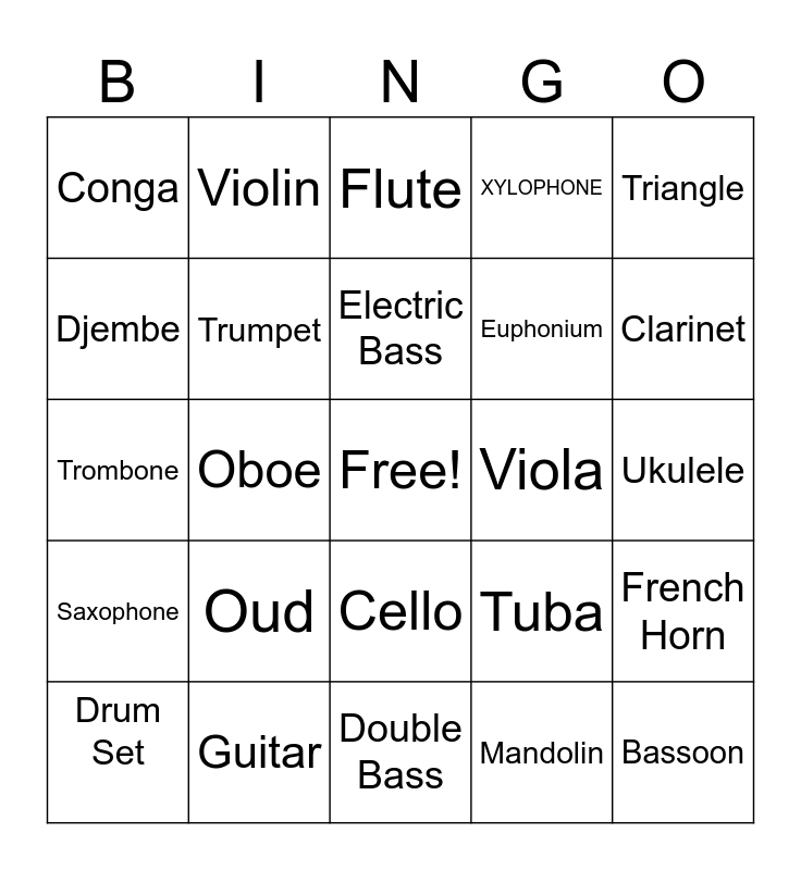This bingo card has a free space and 24 words: Oud, Guitar, Electric Bass, Drum Set, Triangle, Conga, Djembe, Violin, Viola, Cello, Euphonium, Trombone, Tuba, French Horn, Trumpet, Mandolin, Ukulele, Flute, Clarinet, Oboe, Bassoon, Saxophone, XYLOPHONE and Double Bass.