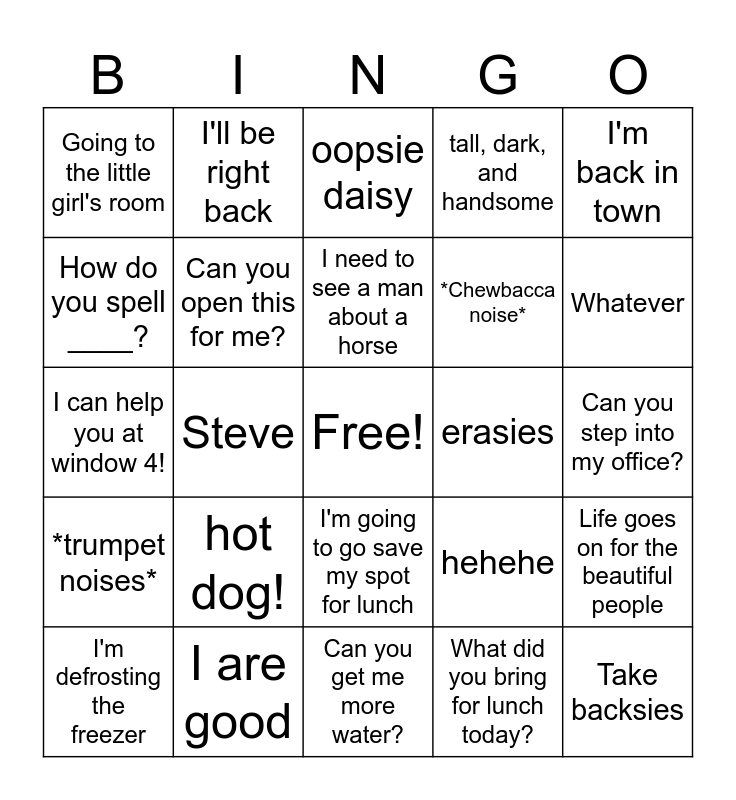 This bingo card has a free space and 24 words: hot dog!, I are good, I need to see a man about a horse, I'm defrosting the freezer, I'm back in town, Going to the little girl's room, How do you spell ____?, I'll be right back, erasies, I'm going to go save my spot for lunch, *Chewbacca noise*, I can help you at window 4!, hehehe, Life goes on for the beautiful people, Can you open this for me?, What did you bring for lunch today?, Can you step into my office?, oopsie daisy, Whatever, Steve, Take backsies, *trumpet noises*, tall, dark, and handsome and Can you get me more water?.